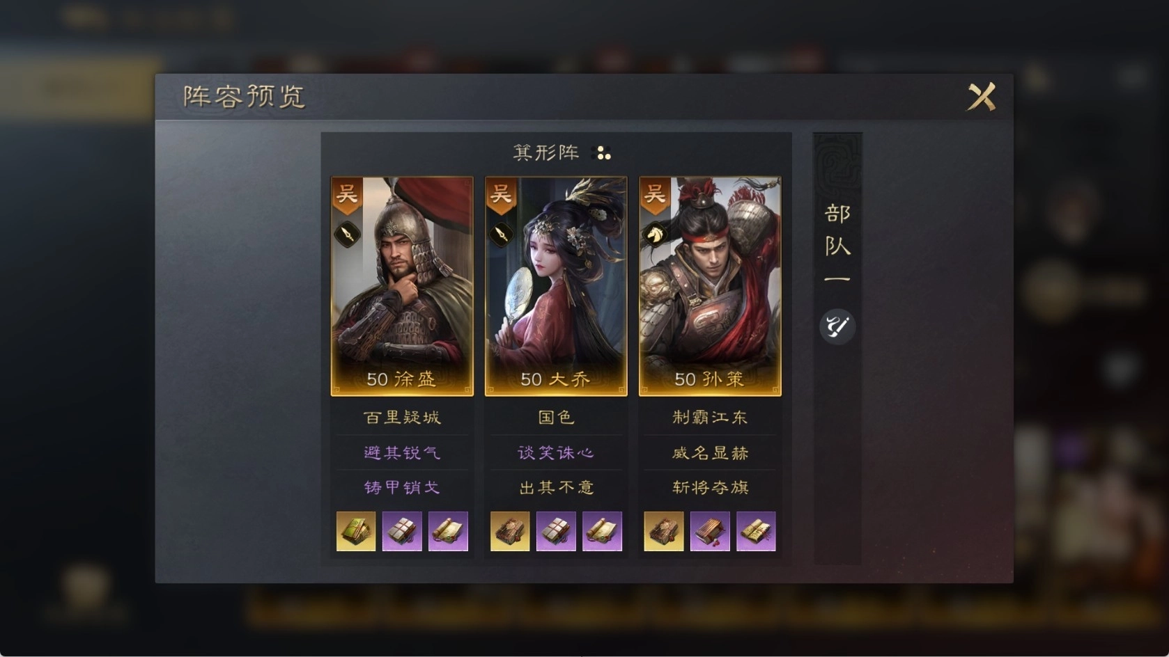 孙尚香可替换为孙策,携带战法【兵贵神速】【骁勇之姿】,大乔的【出其不意】替换成【舍生取义】。输出位替换为孙策,同样也有爆发输出。