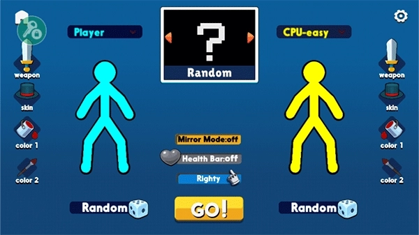 2、选好模式与人数后,会进入对局准备界面。在这里,玩家可以为火柴人更换装备、皮肤等;一切准备就绪后,点击“go”即可进入游戏。
