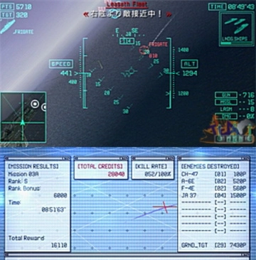 攻略要点:作为游戏的首个关卡,难度相对较低。这是首次在掌机上体验正式的皇牌空战系列作品,操作上有不少新变化,建议先花时间熟悉操作方式。过程中敌军会分3次派出增援,但这些敌机的性能都比较弱,只要将所有敌人全部消灭,就能轻松通过这一关!