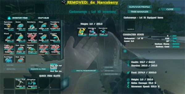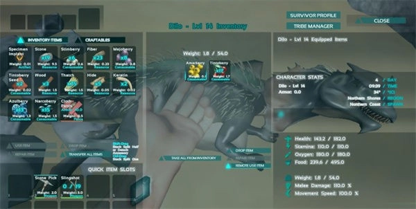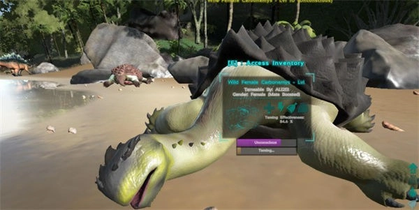 当我们把恐龙击晕后,它的头顶会弹出一个带有紫色条的对话框。接着按e键打开自己的背包,把食物放到中间恐龙的背包里,恐龙就会吃掉这些食物,不过恐龙的负重存在上限。
