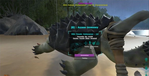 接下来准备阶段到此结束,接下来找到自己想要驯服的恐龙,然后使用拳头,棒子这种钝器来不断攻击恐龙,切记不要使用弓箭这种锐利的武器;
