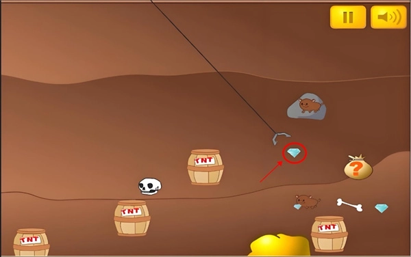 2、在游戏里,矿工的工作无需你冒着生命危险下矿井挖掘,只要精准计算角度和把握时机,就能成为一名优秀的矿工。游戏采用关卡制推进,在土地的横截面上,会分布着宝石、岩石、炸弹以及加时道具等各类物品。你需要找准合适的角度,点击画面来发射顶部的宝石绳爪,从而获取绳爪第一个触碰到的物品。