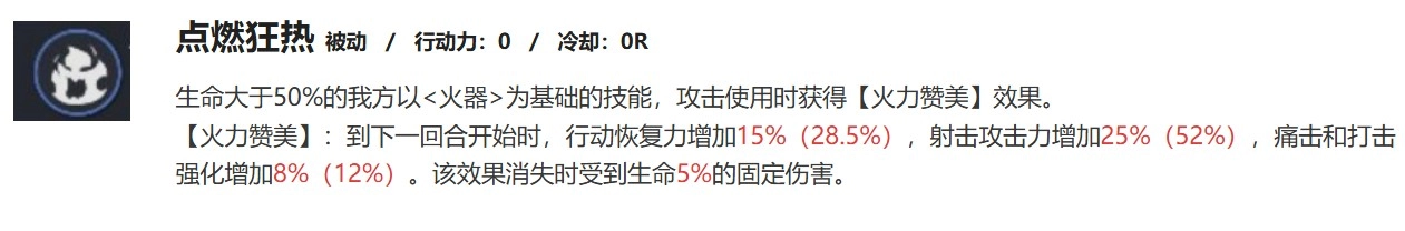 ufeff6级【火力赞美】22.5%行动力恢复力,40%射击攻击攻击力,10.5%痛击强化,10.5%打击强化。回合结束时受到5%最大生命值的固伤。