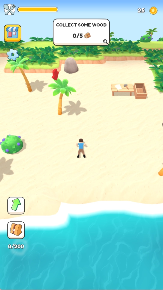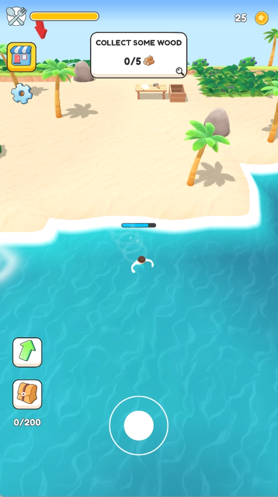 1、点击屏幕中间的按钮来操控角色移动,优先前往树木等资源点,开启初期的资源收集工作,为后续的建设打下基础。