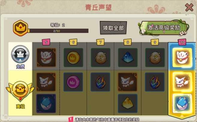 注意啦,青丘声望奖励设有免费档与高级档两种。高级档激活后即永久生效,只要声望等级提升,就能领取发放到主场景的稀有资源、S级幻兽仙狐等丰厚奖励,简直超值!