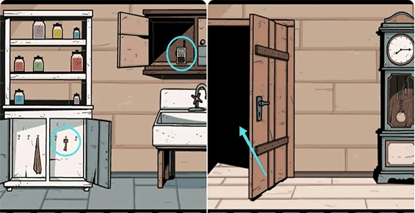 2、推开那扇蓝色的门进入盥洗室,按照照片给出的提示调整架子上罐子的排列顺序。调整完毕后,就能拿到下方的钥匙,接着打开水池上方的柜子取到对讲机。之后回到主场景,用这把钥匙打开钟表左边的门。