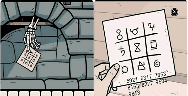 5、走到壁炉旁,掀开画框上的白布以触发剧情。随后用对讲机对准壁炉,接收一张纸条。仔细观察纸条上的符号,再结合收音机的频道数字,推导出四个符号组成的密码。