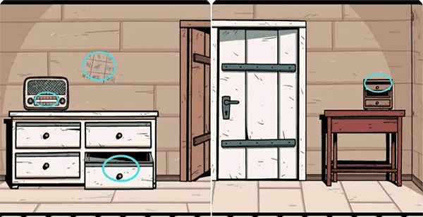 4、到白色门右侧的抽屉柜里找出两节电池,把它们装到对讲机里。之后把频道调到4,听听对讲机里播放的音乐。再点击收音机,把频道调整到和你听到的音乐相对应的频道(要注意记好频道数字,不同的音乐对应不同的频道)。