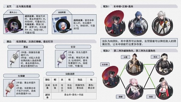 虽然给出了这些搭配建议,但核心只需遵循【长命锁+破韧+支援】的基础框架就行,双辅助或双破韧的组合可以根据个人偏好来调整,双破韧的搭配有一定的发展空间,双辅助的组合则稍显欠缺。