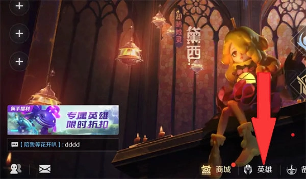 1、进行游戏,选择下方的【英雄】。