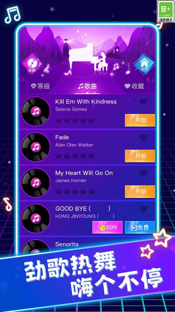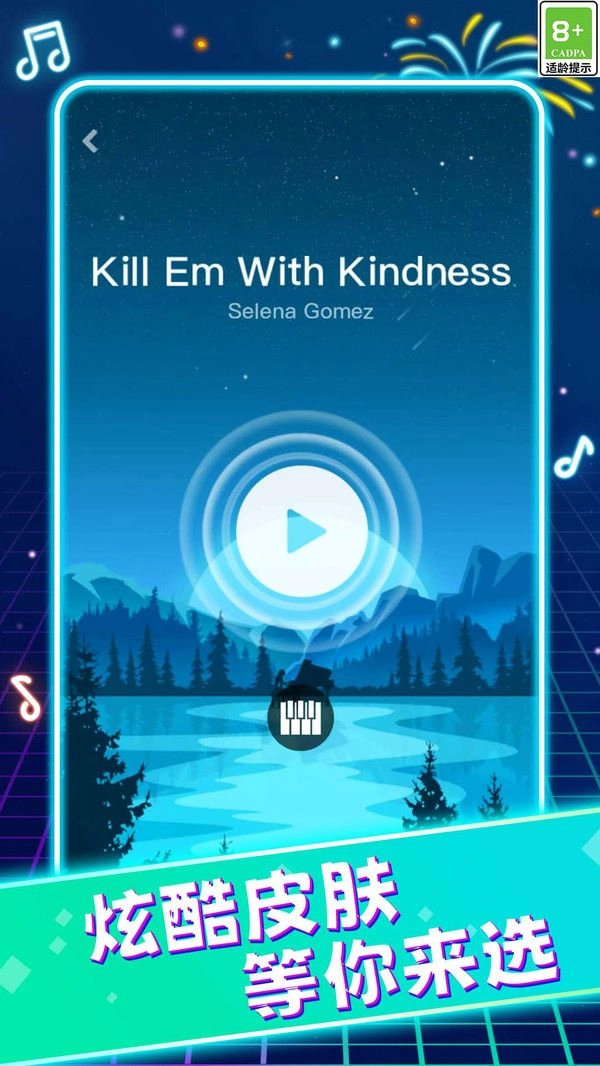 1、屏幕音符依节奏下落,玩家需精准点击,时机越准得分越高,考验反应与节奏感。
