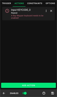 在这个简单的演示里,我会从KEYCODE选项卡中选择KEYCODE_0,这个操作能模拟按下键盘上的0键。键映射器会提示你是否需要进行额外步骤来确保该操作生效。图片里的操作环节有一条错误提示,告知你需要“启用”键映射器键盘。点击这个操作就能跳转到对应的设置界面,方便你解决这个问题。接下来我会讲解如何设置关键代码动作,毕竟这类动作的使用频率最高。