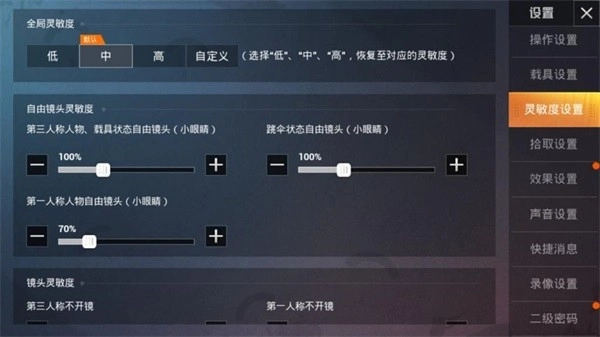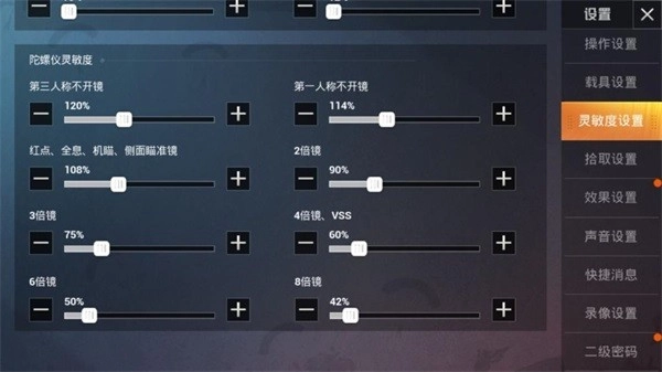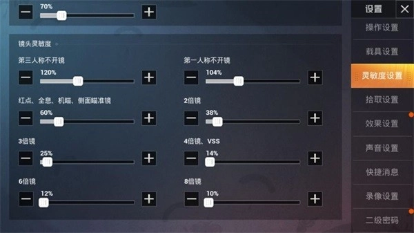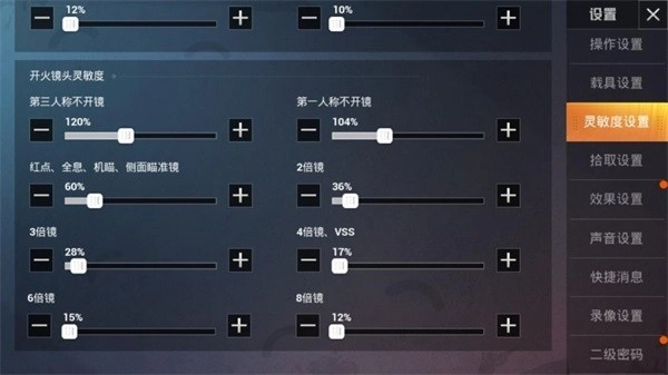 这是用于角色不开枪时观察周围环境的,所以建议大家把它调到较高水平。第三人称不开镜时设为120%,第一人称不开镜时设为104%,这样的灵敏度足以满足基本的转向需求。