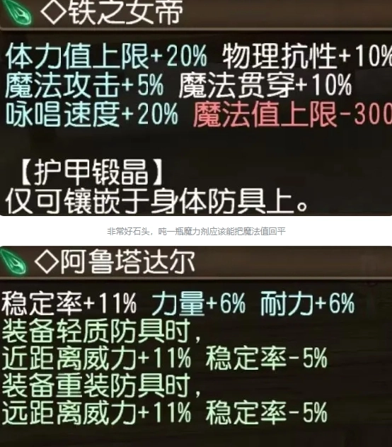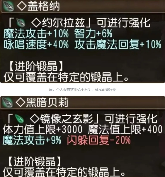 魔导的攻击力和为了潜力造成的负面无所谓,不要往上面装任何石头,也不需要去装石头