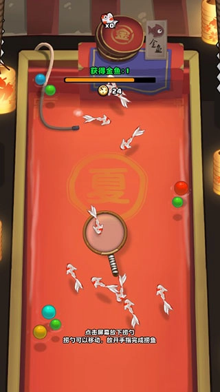 3、点击屏幕放下捞勺,捞勺可移动,放开手指完成捞鱼。
