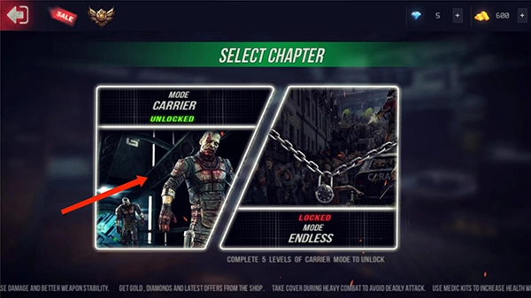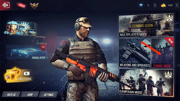 1、打开终极战斗打击最新版,进入游戏主界面,选择右方【ZOMBIEMODE】僵尸模式选项,