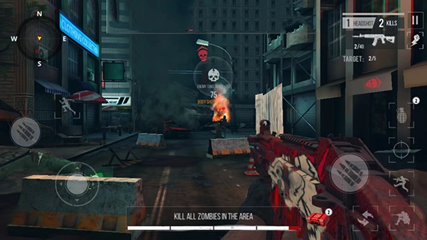 6、进入战斗界面,会听到僵尸的叫声,注意观察你的四周,通过射击或者扔雷,把所有的僵尸消灭,