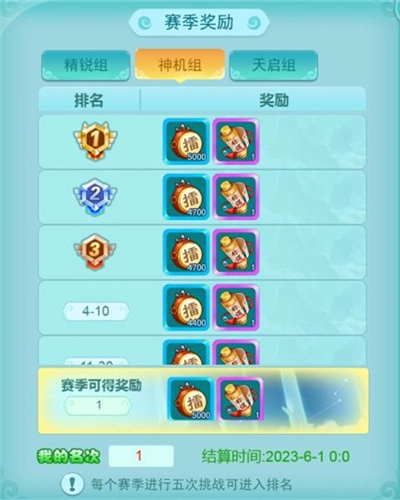 少侠在此处不仅可以查看各组别不同排名对应的赛季奖励之外,还可以查看本赛季奖励的结算时间、少侠目前排名情况等等。