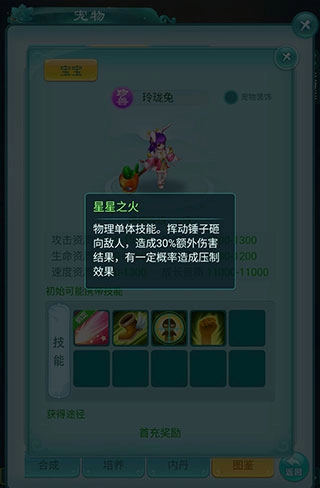除了传统宠物,《逍遥情缘》里还有一类很适合萌新带的宠物——珍兽。目前游戏里能获取的珍兽主要是充值礼包中的玲珑兔,只要随便充点钱就能立刻获得,简单到不行!玲珑兔的亮点在于它的特殊技能“星星之火”,不仅伤害可观,还能压制敌人,外形更是超级可爱,反正瑶瑶对它喜欢得不得了~