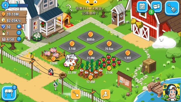 其实这款游戏算不上真正的经营模拟类游戏,毕竟所有流程基本都预先设定好了,任务也是按部就班的,比如收集指定数量的金币、种植特定的作物等。它和其他农场游戏不太一样,不需要购买种子,因为可种植和养殖的种类很有限,你要做的就是让这些作物和养殖物不断快速繁殖。