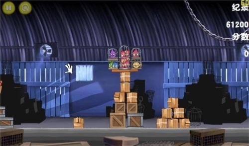 这一关也是,让红色小鸟摧毁左边的笼子;然后让其下落的时候击中右边的障碍物下部来让右边的建筑物失去平衡。