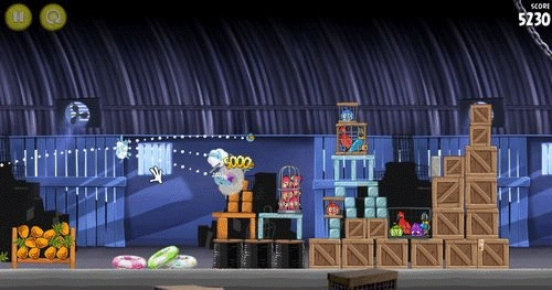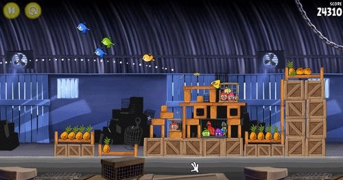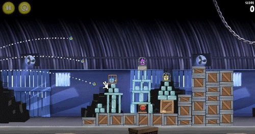 这一关也是如同前面。让小鸟散射摧毁前面的两个建筑物;然后让剩余的物件在推到最右边的建筑物