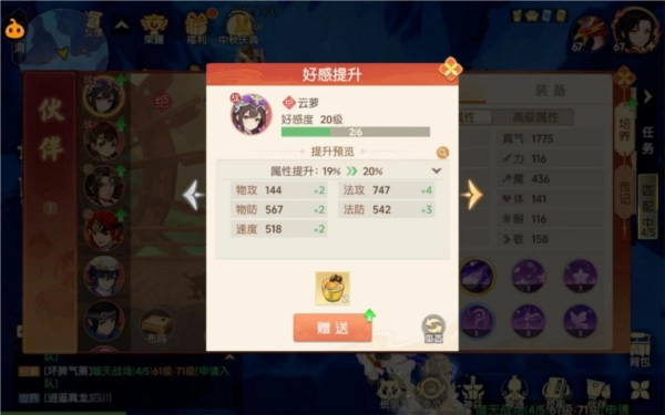 除了装备提升属性外,玩家给伙伴喂食青丘白菜和神木佛跳墙提升好感度,也可以给伙伴基础属性提供一定的加成。