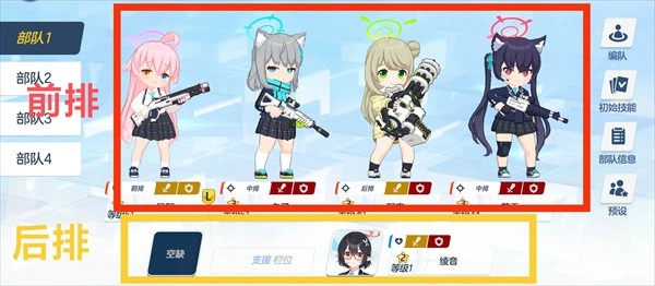 队伍分为:4名“突击学生”(前排) + 2名“支援学生”(后排);
