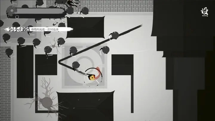 游戏的核心设定围绕气力值与弹射机制展开。气力值的多少决定了冲刺距离的长短;当冲刺过程中碰到障碍物时,角色会发生反弹,并且冲刺距离也会相应增加;而冲刺途中达成的连击次数越多,气力值的回复量就越大,这样落地后就能迅速再次施展剑招。所以,玩家需要对冲刺的路线和落点进行合理规划,既要尽可能达成更多连击,又要防止自己陷入敌人的包围之中。