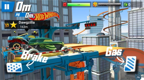 4、此时我们便正式开启比赛,一同参与的还有一位对手,游戏的操控方式十分简便,左侧按钮用于刹车,右侧按钮用于加速。