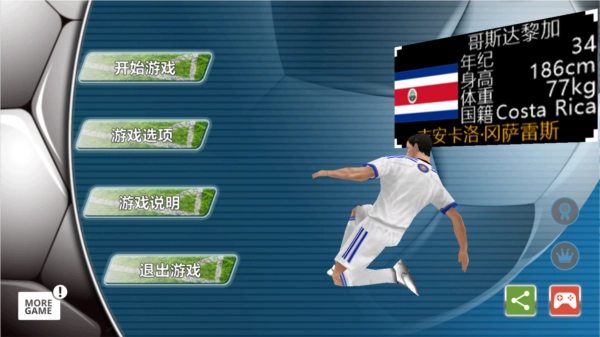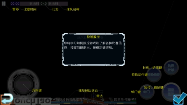 2.上手简单,精通有深度:和AI队友配合把握时机,就能打出流畅的进攻和精彩的射门。主菜单的“游戏说明/帮助”里有详细操作指南。操作采用国际通用设定:1个方向圆盘控制移动(内圈常速,外圈加速),4个按键分别对应短传、长传、射门和特殊带球。