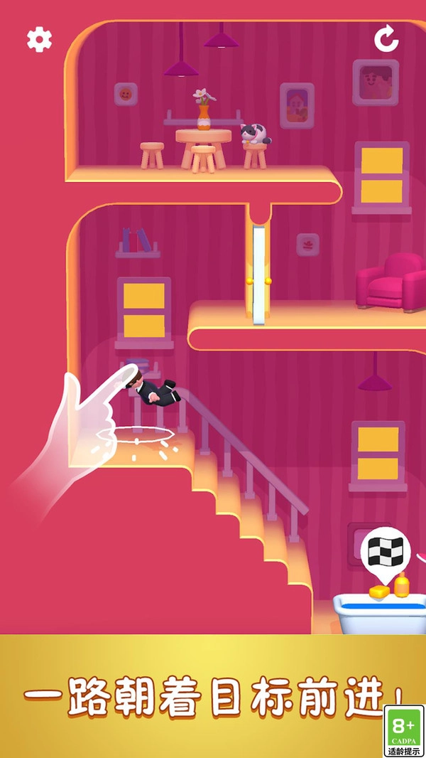 2、根据场景互动提示,操控角色完成指定动作要求,如触发机关、搬运道具等核心玩法。