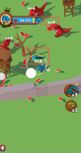 1、游戏初期,优先控制蓝色恐龙收集红色肉块,提升经验值升级。