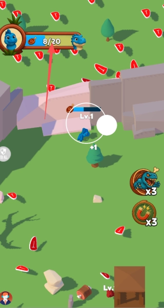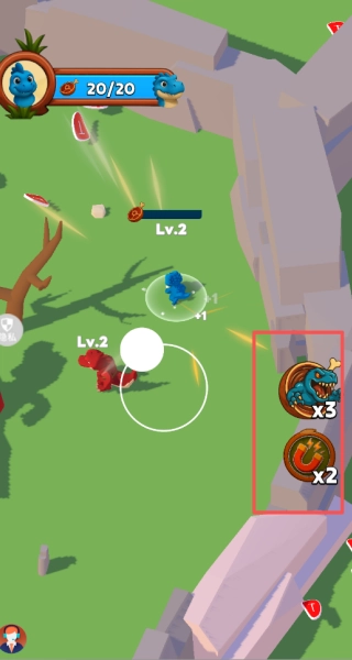 4、当等级提升到Lv.2后,就可以合理运用右侧的技能道具了。比如使用恐龙攻击技能能够一次性打倒多个低等级恐龙,而磁铁技能可以大范围地收集肉块。